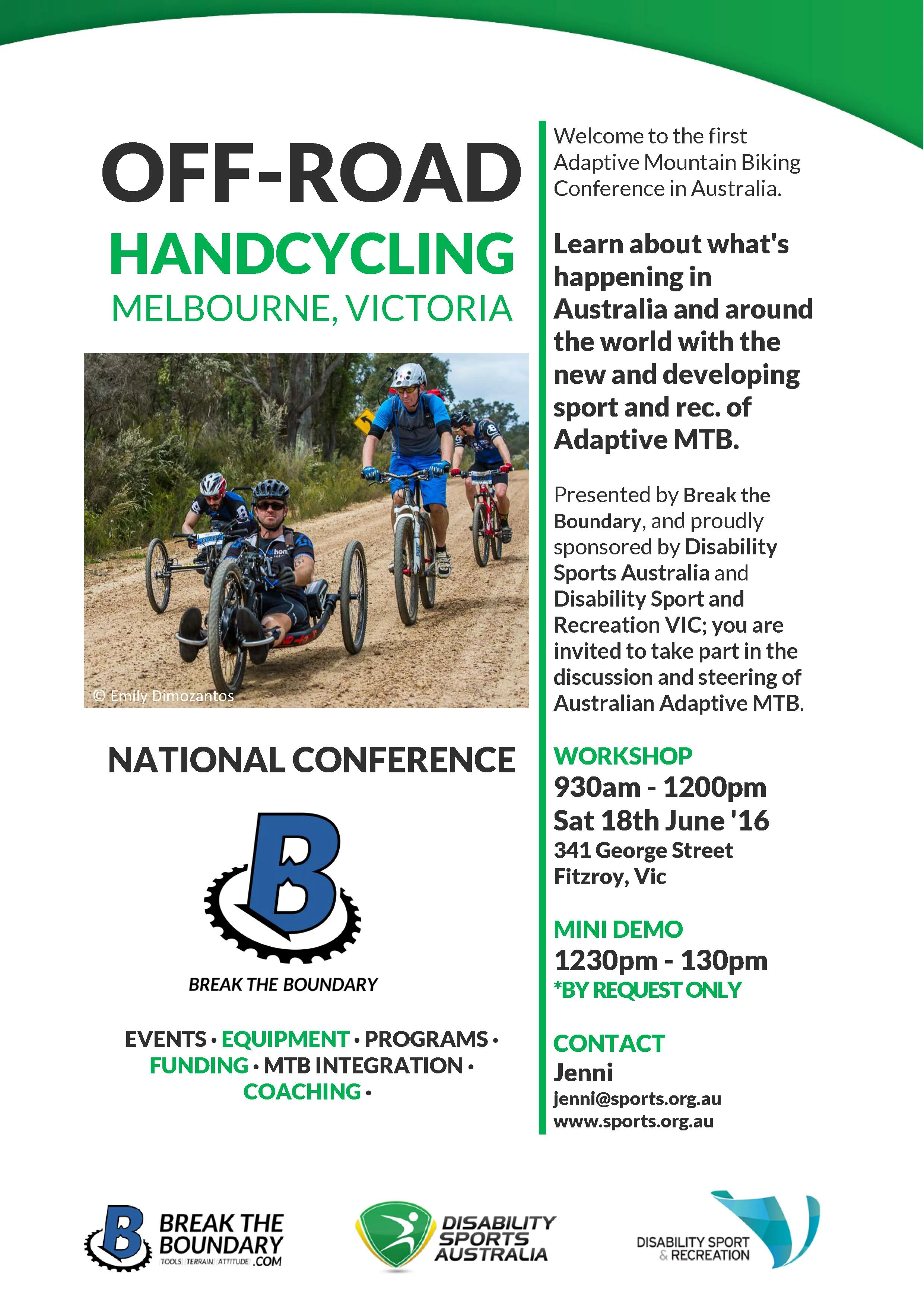 Join the discussion about the developing sport of off-road handcycling at Australia’s first Adaptive Mountain Biking Conference in Melbourne on June 18th 2016.